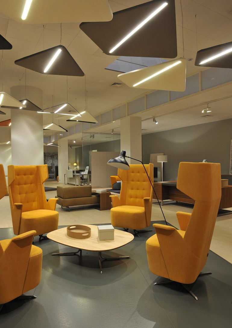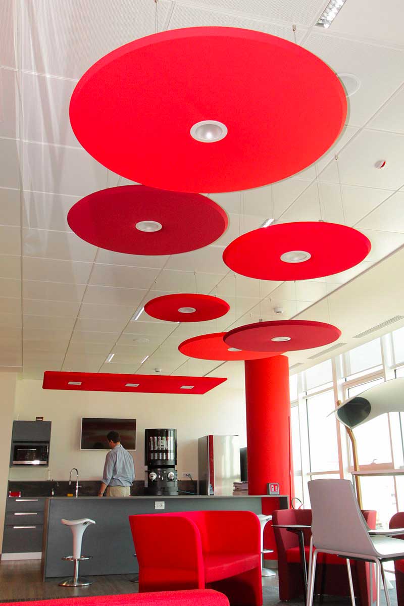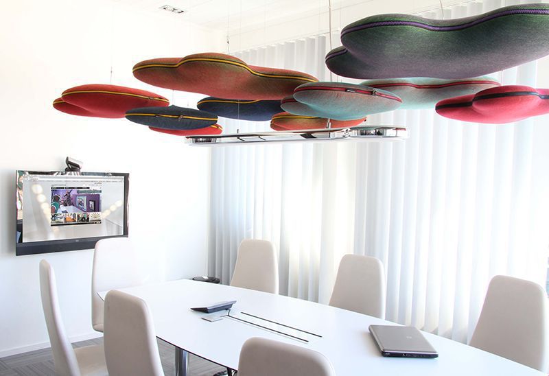 Pour délimiter une hauteur de plafond importante, vous pouvez opter pour des panneaux acoustiques à suspendre au plafond. Décoratifs et légers, ils sauront créer une ambiance chaleureuse et permettront une absorption sonore grâce a leurs propriétés ! Ils contrôleront la réverbération de n’importe quelle pièce.